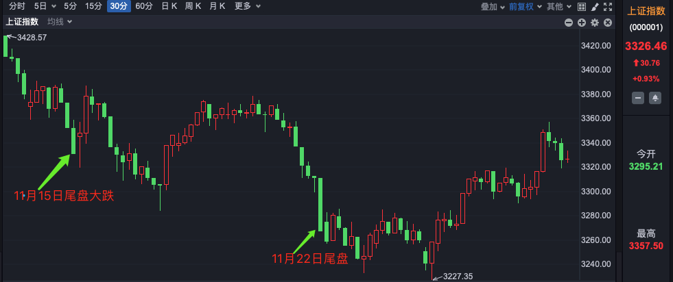 进入11月以来,周五尾盘跳水似乎成为了A股的“惯性”。在刚刚过去的两个周五(11月15日、11月22日)尾盘在线配资公司股票,股市均出现了较大幅度的回调。但今天,A股尾盘稳住了,三大指数集体收涨。